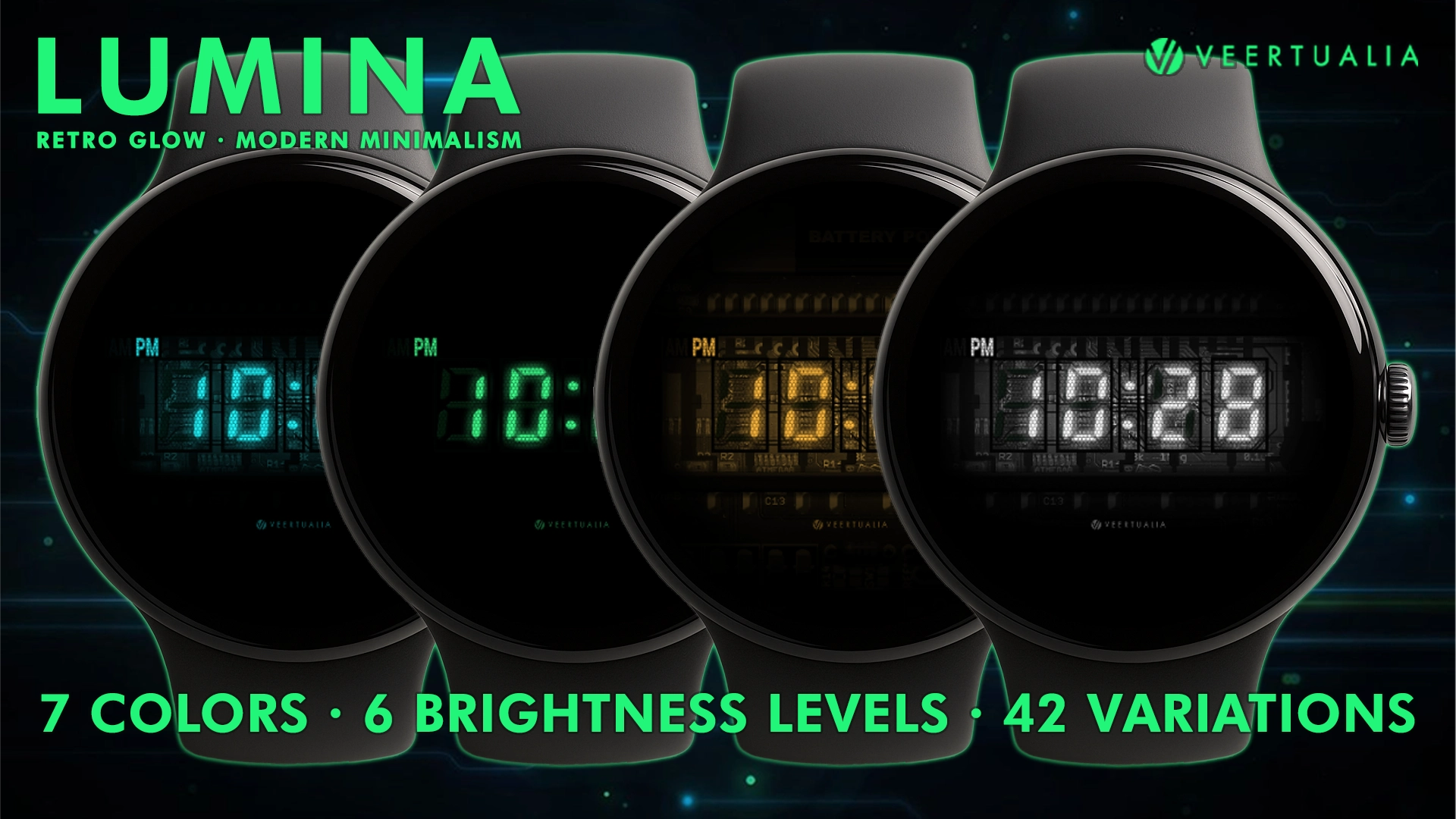 The Lumina watch face brings a refined retro-futuristic aesthetic to your wrist, inspired by authentic vacuum fluorescent displays. Crisp VFD numerals glow with clarity, simplicity and timeless digital minimalism.